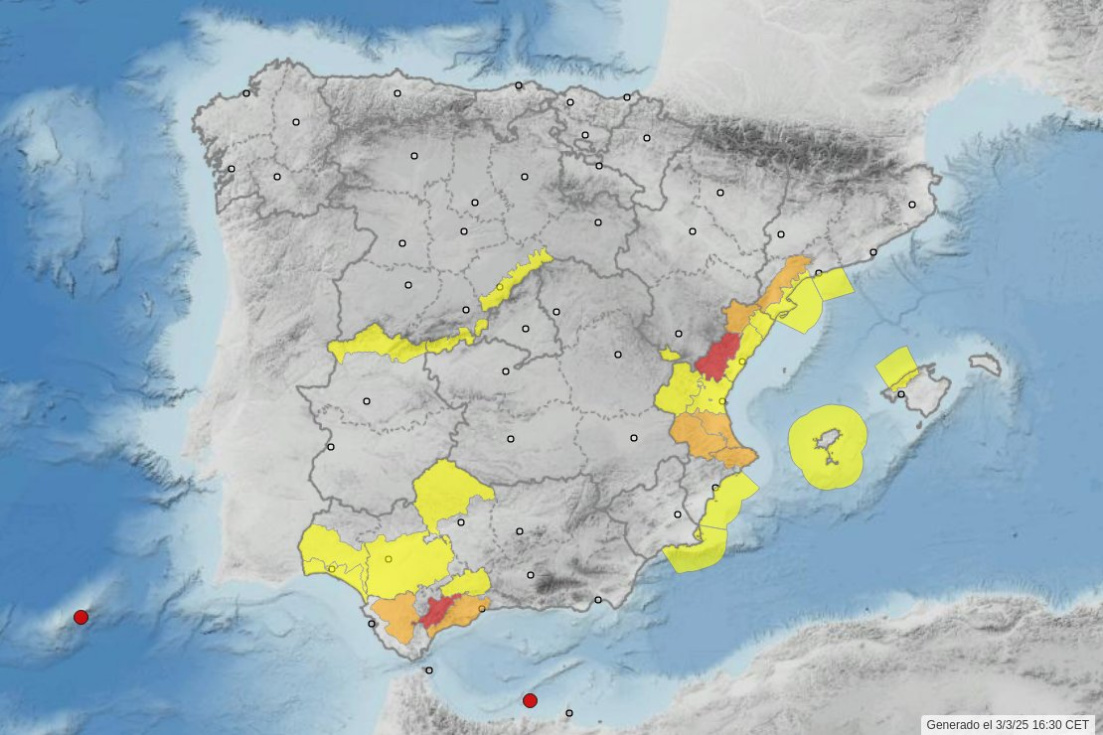 - Lunes 3 de marzo: Se prevén acumulaciones importantes en el interior de Málaga, la Comunidad Valenciana y el sur de Tarragona, con episodios de lluvias fuertes o muy fuertes y persistentes. En algunas zonas se podrían superar los 100 l/m² en 12 horas.