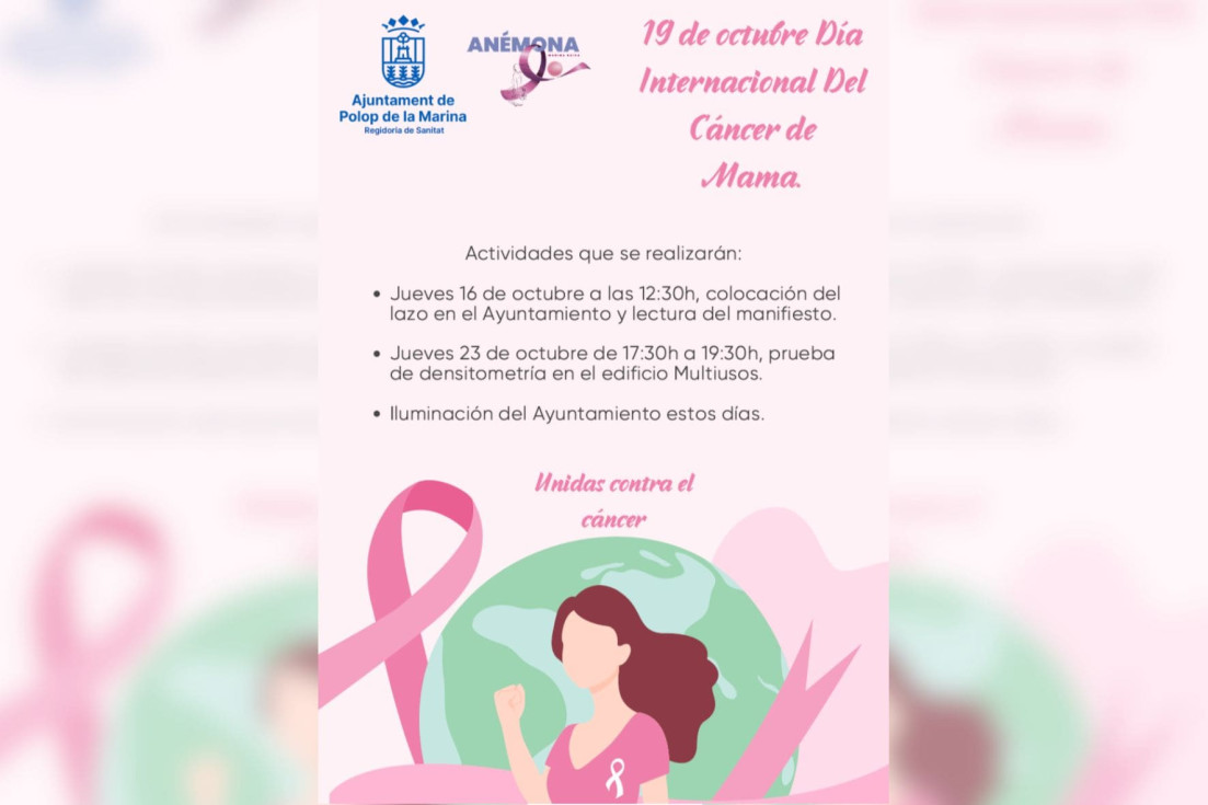 Desde la concejalía de Sanidad se han organizado dos iniciativas que pretenden dar visibilidad a la causa y reforzar el mensaje de apoyo a las personas afectadas. El próximo jueves 16 de octubre, a las 12:30 horas, se colocará un lazo rosa en la fachada del Ayuntamiento de Polop y se procederá a la lectura del manifiesto institucional, como gesto simbólico de unidad y solidaridad con todas las mujeres que luchan contra esta enfermedad.