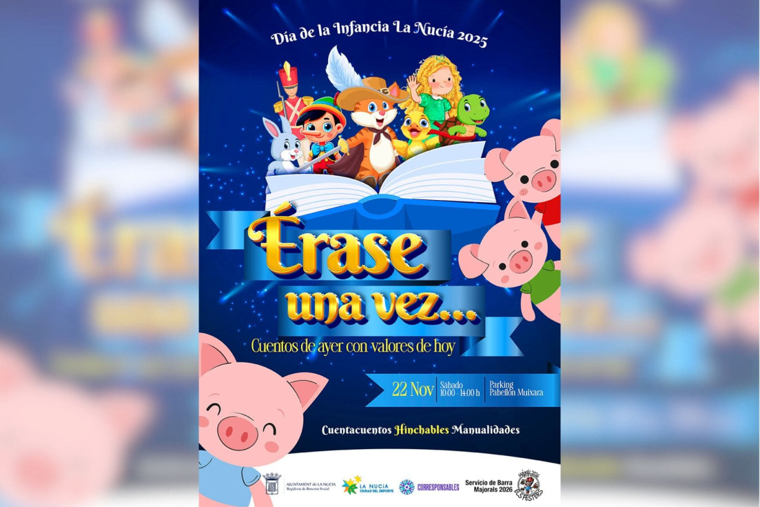 Este sábado por la mañana se celebrará la XVII edición del Día de la Infancia de La Nucía bajo el título “Érase una vez…” en el parking del Pabellón Muixara, con entrada gratuita. Los protagonistas de esta edición serán “Los Cuentos del ayer con valores de hoy…”, por lo que todos recordarán a Pinocho, el Gato con Botas, el Soldadito de Plomo, El patito Feo, los 3 Cerditos, Ricitos de Oro… y muchos más. Habrá talleres de manualidades relacionados con los cuentos tradicionales, cuentacuentos e hinchables.