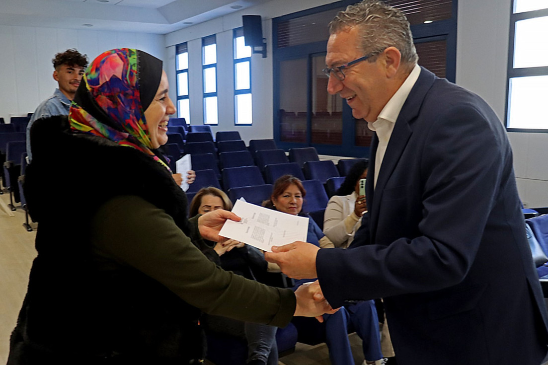 Durante el acto, el primer edil ha felicitado públicamente a todas las personas participantes por el esfuerzo realizado para obtener esta acreditación y se ha interesado por la situación personal de cada una de ellas y de sus familias. Así, por ejemplo, ha querido conocer si tienen hijos o hijas pequeños y en qué centros educativos de la localidad estudian y ha puesto a la escuela pública como ejemplo “espacio en el que se favorece la integración y la inclusión de los menores, independientemente de su procedencia y de sus capacidades”.