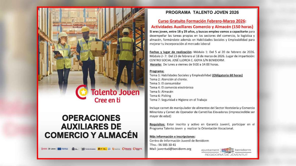 La Concejalía de Juventud del Benidorm, en colaboración con la Cámara de Comercio de Alicante, pone en marcha un curso de Operaciones Auxiliares de Comercio y Almacén con el objetivo de mejorar la empleabilidad de la juventud del municipio.
