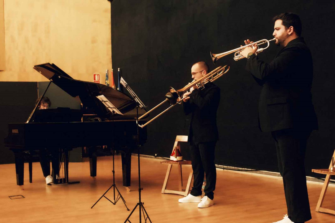 La formación integrada por trompeta, trombón y piano interpreta el programa ‘Kaleidos Origins’ en el Salón de Actos del Ayuntamiento
