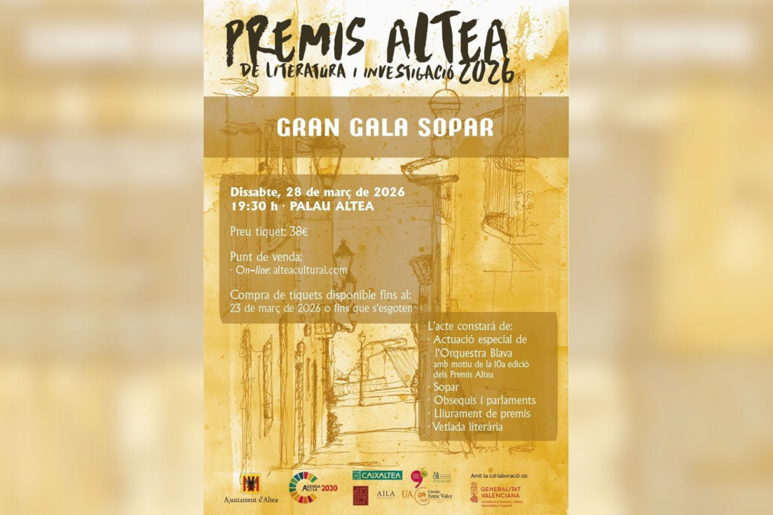 El Ayuntamiento de Altea ha anunciado la puesta a la venta de las entradas para la gala y cena de los Premis Altea de Literatura i Investigació 2026, uno de los eventos culturales más destacados del municipio, que se celebrará el sábado 28 de marzo a las 19:30 horas en el Palau Altea.
