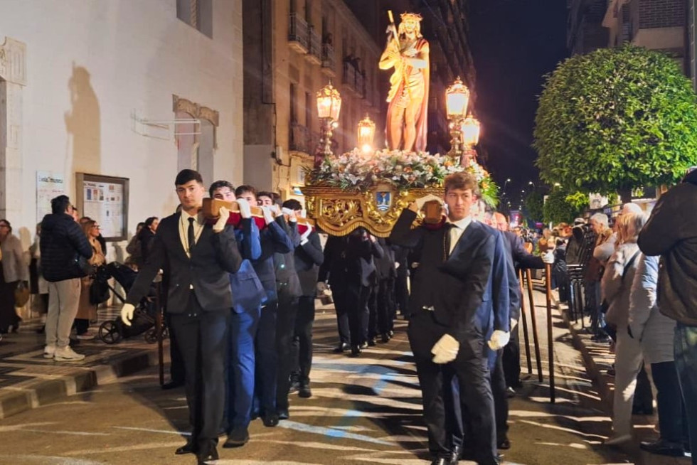 La cofradía Ecce Homo ha protagonizado la noche del Jueves Santo de la Semana Santa de Villajoyosa. La imagen, conocida popularmente como “el Senyor de la Canyeta”, ha sido trasladada en procesión desde la calle Camino Viejo de Valencia, por la calle Colón, hasta llegar a la iglesia de Nuestra Señora de la Asunción, acompañada de sus cofrades.