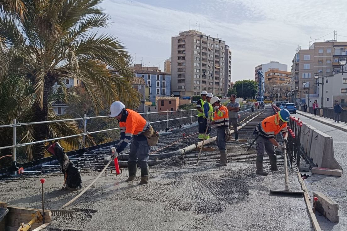 Las obras de ampliación del tablero del Puente del río Amadorio (calle Cervantes) de Villajoyosa continúan en marcha con el hormigonado de la losa que permitirá ampliar la anchura de este puente.