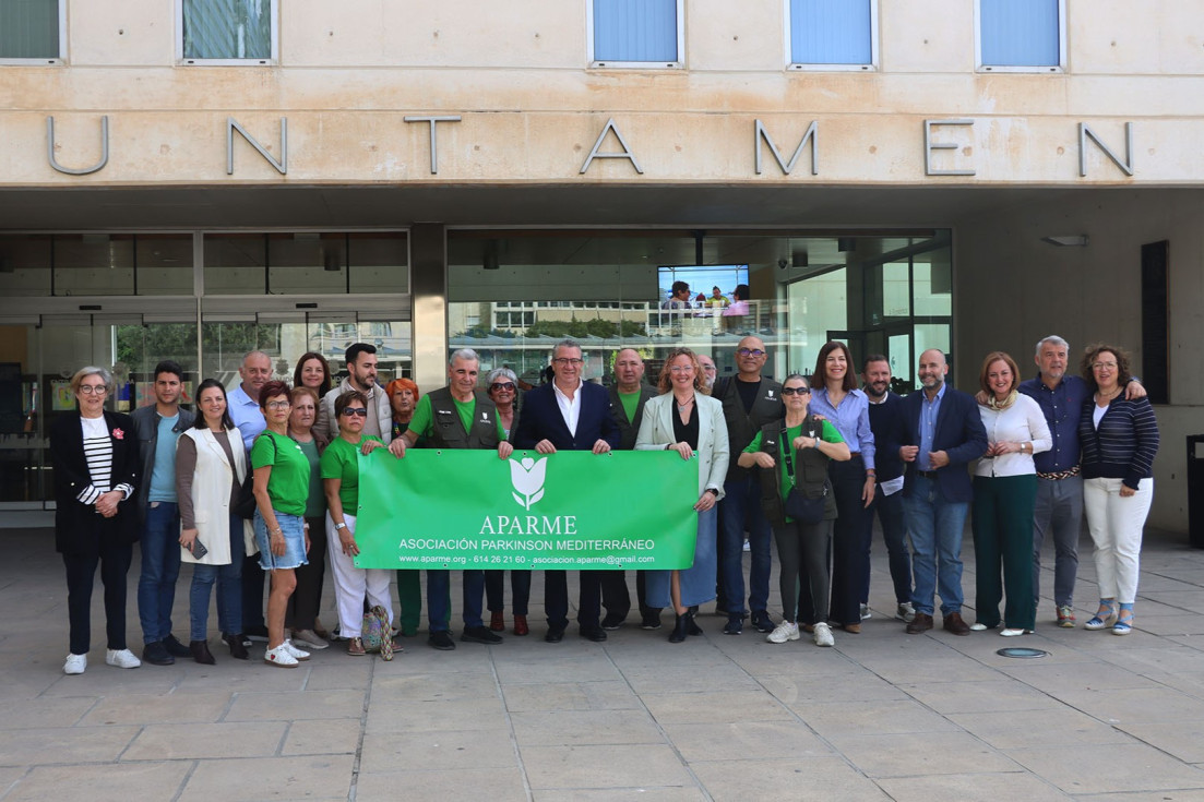 La corporación municipal, encabezada por el alcalde, Toni Pérez, y por la concejal de Bienestar Social, Ángela Zaragozí, acompañada de integrantes de APARME (Asociación Parkinson Mediterráneo), se ha concentrado hoy en la Plaza de SSMM Reyes de España para dar visibilidad a esta enfermedad neurodegenerativa.