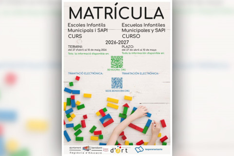 El Ayuntamiento de Benidorm abrirá este lunes 27 de abril el plazo para solicitar plaza en las tres escuelas infantiles municipales de la ciudad –Fontanelles, Les Caletes y El Tossalet– y en el Servicio de Atención a la Primera Infancia (SAPI) Nanets. La concejal de Educación, Maite Moreno, ha avanzado que “la oferta provisional para el curso 2026/2027 de Infantil de 0 a 2 años en la red municipal es de 199 vacantes para familias con menores nacidos en los años 2024, 2025 y 2026” y ha agregado que el periodo para formalizar este trámite se prolongará hasta el próximo 10 de mayo.